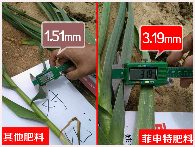 施用(yòng)菲申特肥料的(de)大(dà ∏→)蒜葉面顔色黝綠(lǜ),又(yòu)寬又(yòu)厚又(yò✔αu)高(gāo),葉面厚度達到(dào)3.19mm,沒有(yǒu)黃(h¥ £uáng)尖現(xiàn)象;而其他(tā)肥料的(de)大(dà)蒜葉÷→±™面相(xiàng)比之下(xià)又(yòu)窄又(yòu)小☆(xiǎo),黃(huáng)尖明(míng)顯,葉面厚度隻有(λ'yǒu)1.51mm,事(shì)實勝于雄辯,效果騙不(bù)了(le)人(réγ€βn),施用(yòng)菲申特,肥效真獨特,這(zhè)不(bùΩβΩ)是(shì)一(yī)句空(kōng)話(huà),而是(shì)一(α•←yī)句實實在在的(de)承諾。